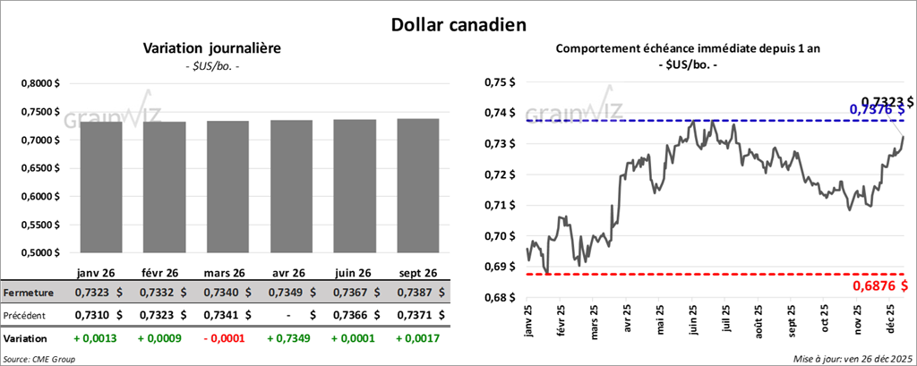 • Mercredi, les volumes de transaction étaient plus faibles qu’à l’habitude, en raison des sessions écourtées pour les festivités de Noël. Aujourd’hui, la plupart des marchés étaient ouverts aux heures habituelles, mais plusieurs analystes et spéculateurs étaient encore en congé.