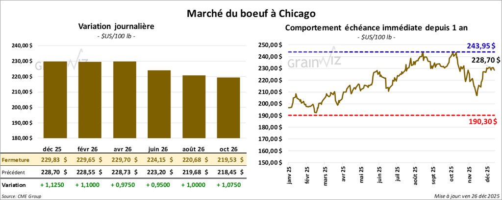 Le contrat de bœuf américain décembre 25 a clôturé à 229,83 $ (+ 1,13 $). Celui février 26 a fermé à 229,65 $ (+ 1,10 $). Celui avril 26 a terminé à 229,70 $ (+ 98 cents).