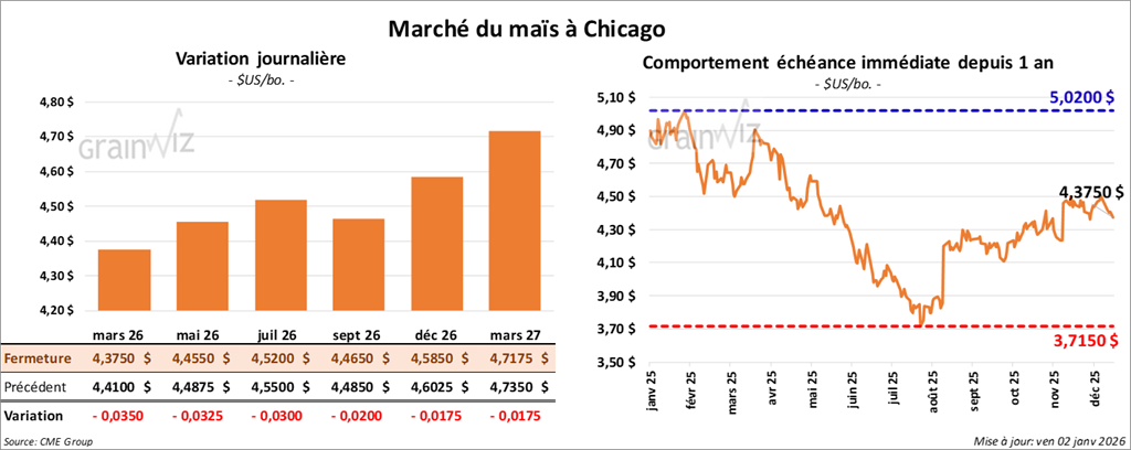 Le contrat de maïs américain mars 26 a clôturé à 4,3775 $ (-3 ¼ cents). Celui mai 26 a fermé à 4,4525 $ (-3 ½ cents). Celui juillet 26 a terminé à 4,5150 $ (-3 ½ cents).