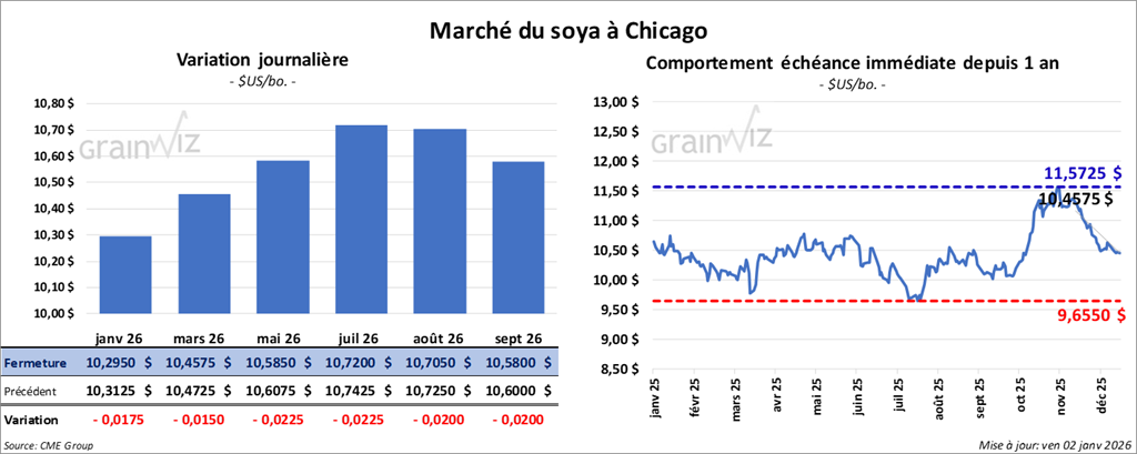 Le contrat de soya américain janvier 26 a clôturé à 10,2850 $ (-2 ¾ cents). Celui mars 26 a fermé à 10,4575 $ (-1 ½ cent). Celui mai 26 a terminé à 10,5875 $ (-2 cents).
