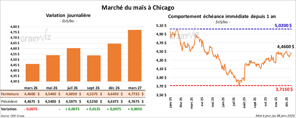 Le contrat de maïs américain mars 26 a clôturé à 4,4600 $ (- ¾ cent). Celui mai 26 a fermé à 4,5400 (0,0). Celui juillet 26 a terminé à 4,6050 $ (+ ¾ cent).
