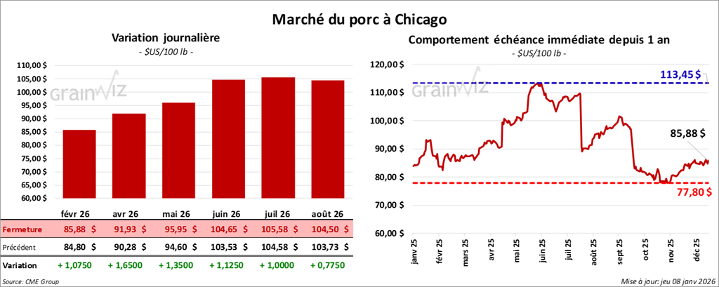 Le contrat de porc américain février 26 a clôturé à 85,88 $ (+ 1,08 $). Celui avril 26 a fermé à 91,93 $ (+ 1,65 $). Celui mai 26 a terminé à 95,95 $ (+ 1,35 $).