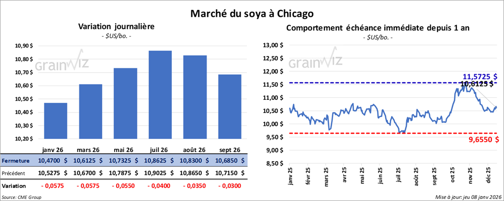 Le contrat de soya américain janvier 26 a clôturé à 10,4700 $ (- 5 ¾ cents). Celui mars 26 a fermé à 10,6125 $ (- 5 ¾ cents). Celui mai 26 a terminé à 10,7325 $ (- 5 ½ cents).