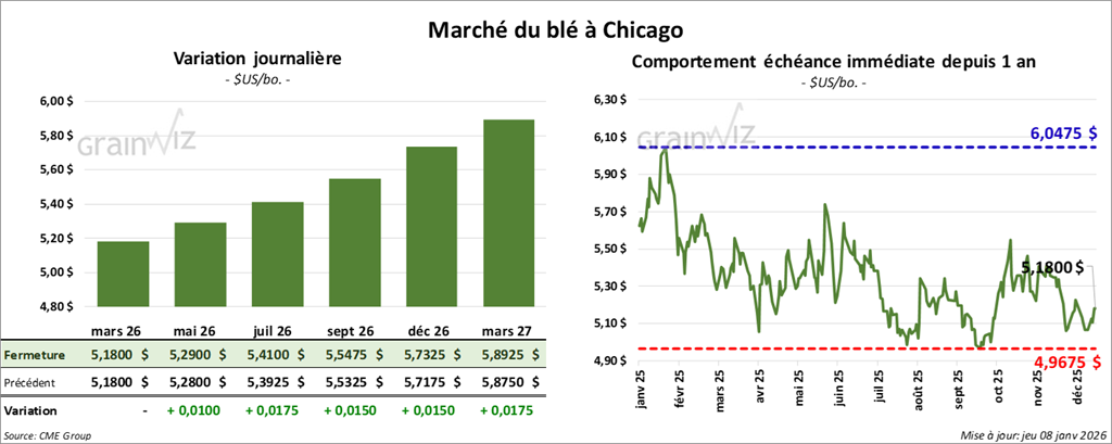 À Chicago, le contrat de blé mars 26 a clôturé à 5,1800 $ (0,0). Celui mai 26 a fermé à 5,2900 $ (+ 1 cent). Celui juillet 26 a terminé à 5,4100 $ (+ 1 ¾ cent).