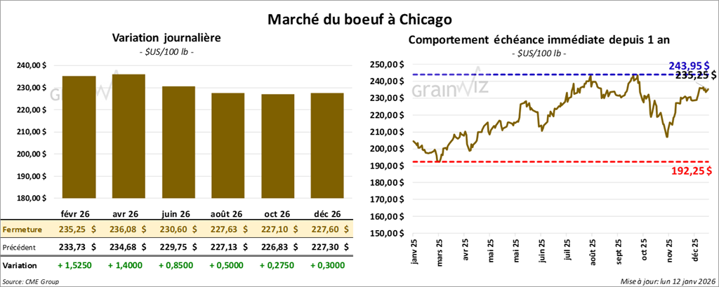 Le contrat de bœuf américain février 26 a clôturé à 235,25 $ (+ 1,53$). Celui avril 26 a fermé à 236,08 $ (+ 1,40 $). Celui juin 26 a terminé à 230,60 $ (+ 85 cents).