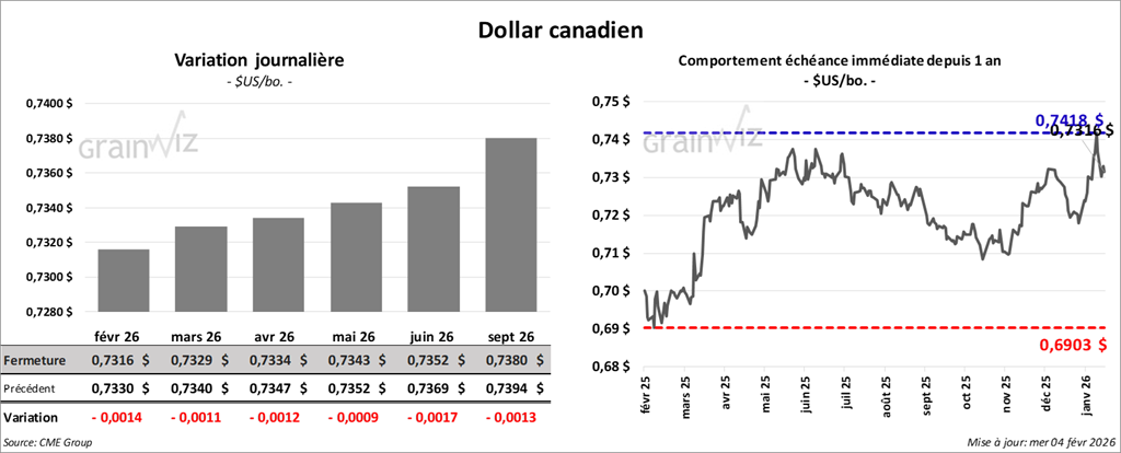 À Chicago, le contrat mars 26 a clôturé à 5,2675 $ (- 2 cents). Celui mai 26 a fermé à 5,3625 $ (- 1 ½ cent). Celui juillet 26 a terminé à 5,4725 $ (- 1 ½ cent).