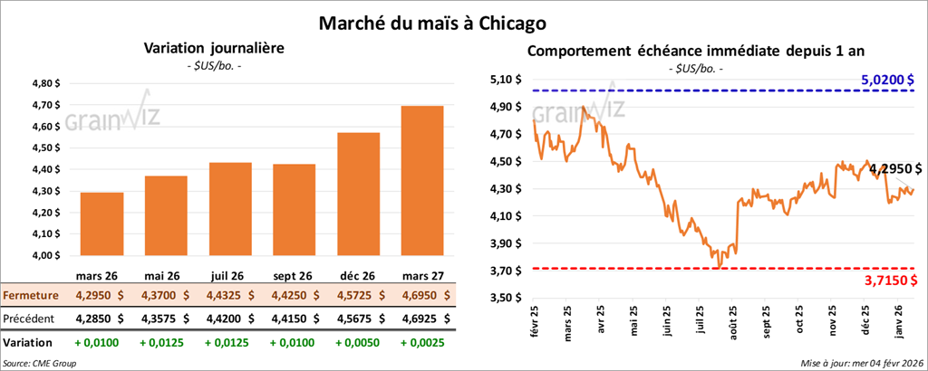 Le contrat de maïs américain mars 26 a clôturé à 4,2950 $ (+ 1 cent). Celui mai 26 a fermé à 4,3700 $ (+ 1 ¼ cent). Celui juillet 26 a terminé à 4,4375 $ (+ 1 ¼ cent).