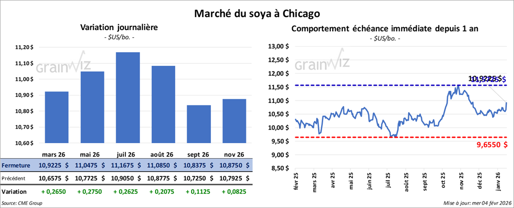 Le contrat de soya américain mars 26 a clôturé à 10,9225 $ (+ 26 cents). Celui mai 26 a fermé à 11,0475 $ (+ 27 ½ cents). Celui juillet 26 a terminé à 11,1675 $ (+ 26 ¼ cents).