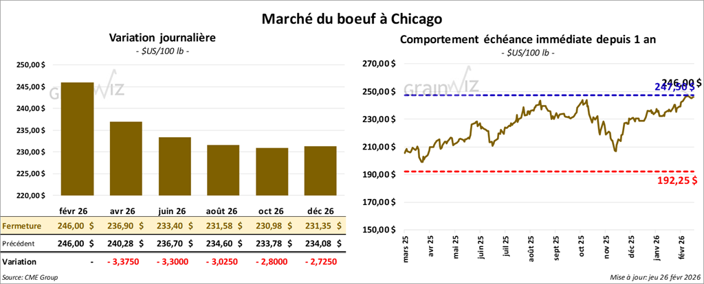 Le contrat de bœuf américain février 26 a clôturé à 246,00 $ (0,0). Celui avril 26 a fermé à 236,90 $ (- 3,38 $). Celui juin 26 a terminé à 233,40 $ (- 3,30 $).