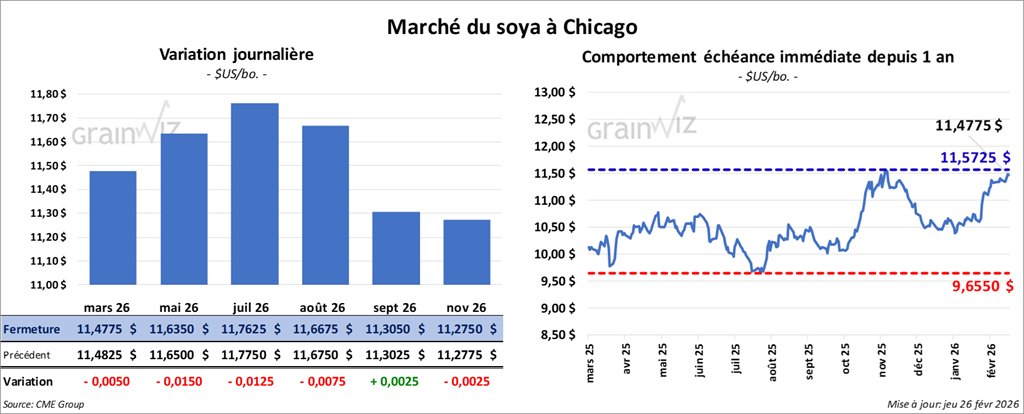 Le contrat de soya américain mars 26 a clôturé à 11,4775 $ (- ½ cent). Celui mai 26 a fermé à 11,6350 $ (- 1 ½ cent). Celui juillet 26 a terminé à 11,7625 $ (- 1 ¼ cent).