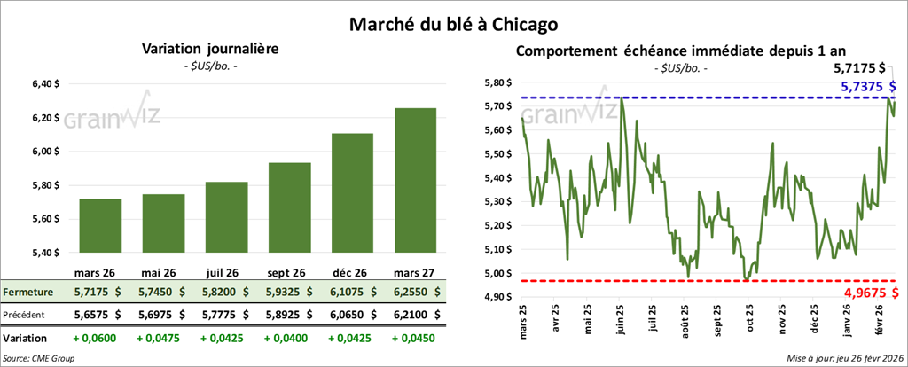 À Chicago, le contrat de blé mars 26 a clôturé à 5,7175 $ (+ 6 cents). Celui mai 26 a fermé à 5,7450 $ (+ 4 ¾ cents). Celui juillet 26 a terminé à 5,8200 $ (+ 4 ¼ cents).