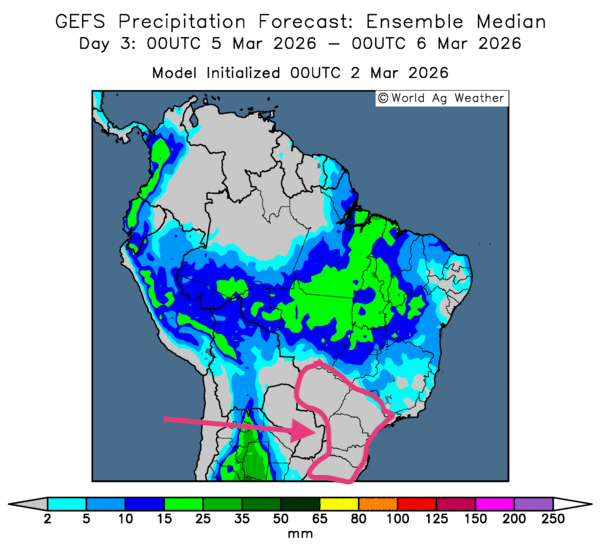- Essentiellement, les prévisions météorologiques pour l'Argentine s'améliorent à court terme. L'analyse des cartes GFS (World Ag Weather), dessinées jusqu'au 3e jour, indique des possibilités de pluies bénéfiques pour les régions asséchées du nord et du centre (voir notamment la carte du 3e jour ci-contre). Toutefois, elle révèle également que certaines parties du centre et du sud de l'Argentine pourraient toujours présenter un manque de précipitations pourtant nécessaires. Cela signifie que plusieurs régions des provinces de La Pampa et de Buenos Aires, notamment, pourraient toujours être confrontées à un temps sec persistant et dévastateur.