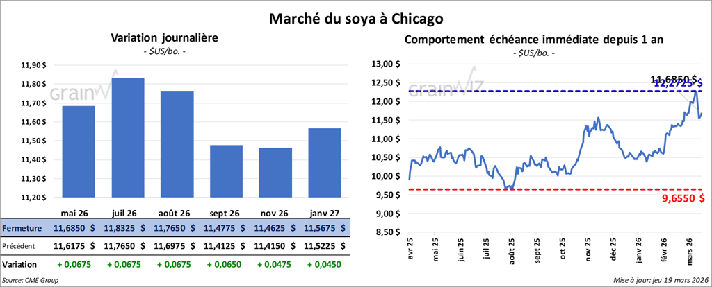 Le contrat de soya américain mai 26 a clôturé à 11,6850 $ (+ 6 ¾ cents). Celui juillet 26 a fermé à 11,8325 $ (+ 6 ¾ cents). Celui août 26 a terminé à 11,7650 $ (+ 6 ¾ cents).