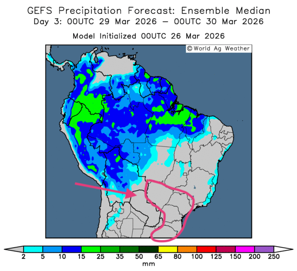 - Globalement, certains changements météorologiques s’opèrent à court terme au Brésil. L’analyse des cartes GFS (World Ag Weather) illustrées jusqu’au 3e jour révèle un assèchement possible, mais bénéfique, pour plusieurs régions du Centre-Sud, du Mato Grosso, puis vers l’est, jusqu’aux États de Bahia et de Minas Gerais. Toutefois, comme le montre la carte du 3e jour, un temps sec et rigoureux devrait persister dans plusieurs secteurs du Sud et du Sud-Est, notamment autour du Mato Grosso do Sul et, plus à l’est, du São Paulo jusqu’au Rio Grande do Sul.