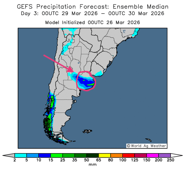- Essentiellement, les prévisions météorologiques demeurent plutôt favorables à court terme pour l’ensemble de l’Argentine. L’analyse des cartes GFS (World Ag Weather) tracées jusqu’au 3e jour indique des probabilités de pluies plus ou moins intenses dans plusieurs secteurs de l’est du pays, notamment aux alentours de la province de Buenos Aires (voir la carte du 3e jour ci-contre). Ailleurs, un temps sec pourrait s’installer. Ces conditions ne devraient toutefois pas poser problème, puisque l’humidité des sols demeure adéquate dans la plupart des régions de production.