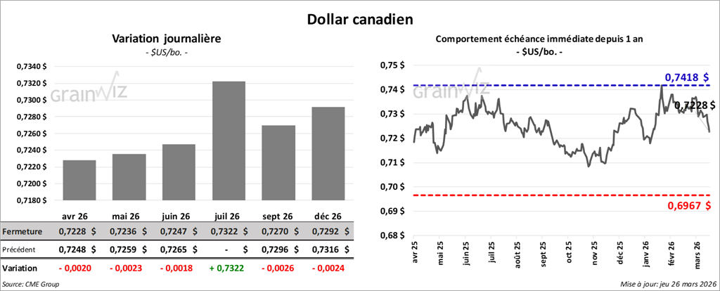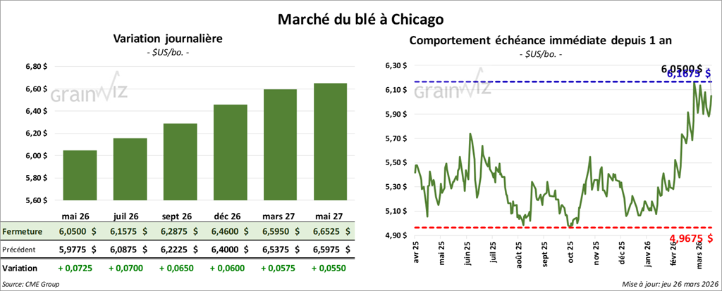 À Chicago, le contrat de blé mai 26 a clôturé à 6,0500 $ (+ 7 ¼ cents). Celui juillet 26 a fermé à 6,1575 $ (+ 7 cents). Celui septembre 26 a terminé à 6,2875 $ (+ 6 ½ cents).