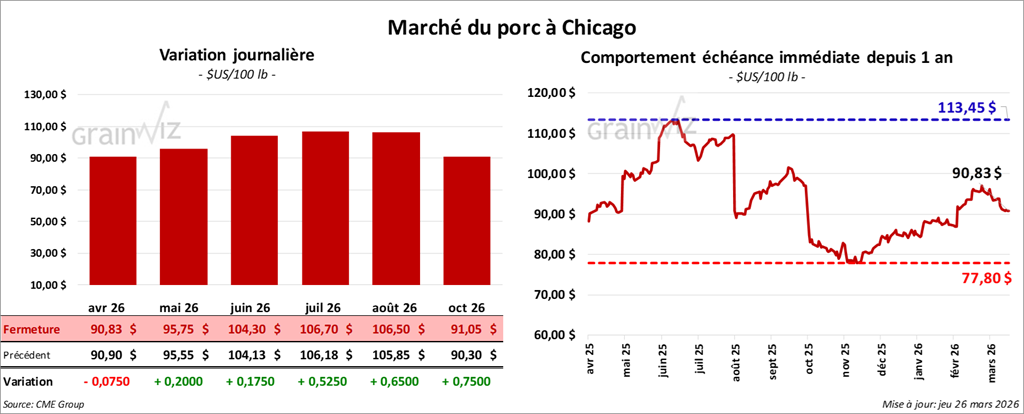 Le contrat de porc américain avril 26 a clôturé à 90,83 $ (- 8 cents). Celui mai 26 a fermé à 95,75 $ (+ 20 cents). Celui juin 26 a terminé à 104,30 $ (+ 18 cents).