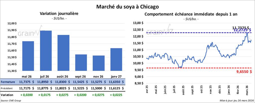 Le contrat de soya américain mai 26 a clôturé à 11,7375 $ (+ 2 cents). Celui juillet 26 a fermé à 11,8950 $ (+ 1 ¾ cent). Celui août 26 a terminé à 11,8300 $ (+ 2 ¾ cents).