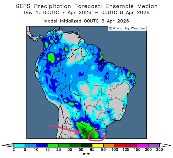 • Globalement, les prévisions météorologiques s’améliorent à court terme pour la majorité des secteurs de production du Brésil. L’analyse des cartes GFS (World Ag Weather), illustrée jusqu’au 3e jour, indique des possibilités de pluie plus ou moins abondante à l’échelle du pays. Comme le montre cette carte pour demain, des averses abondantes, mais favorables, pourraient survenir dans le sud-est, jusque dans les environs du Rio Grande do Sul.