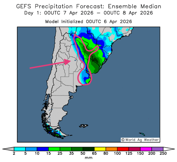 • Essentiellement, les prévisions météorologiques sont à surveiller à court terme pour l’Argentine. L’analyse des écarts du GFS (World Ag Weather), illustrée jusqu’au 3e jour, révèle des possibilités de temps sec persistant dans une majorité des régions argentines. Comme le montre cette carte pour demain, des précipitations demeurent tout de même possibles dans l’extrême nord et dans certaines parties de l’Est, jusque vers la province de Buenos Aires. Dans l’ensemble, toutefois, le stress hydrique subi par les différentes cultures pourrait perdurer à l’échelle de l’Argentine.