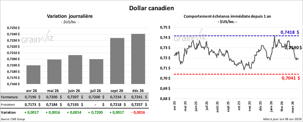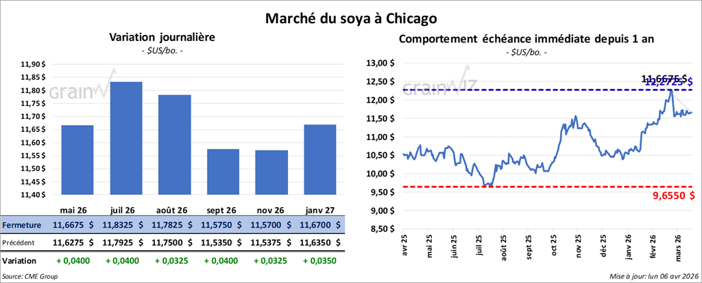 Du côté de l’huile de soya américaine, le contrat mai 26 a terminé à 69,95 $ (+ 101 points). Celui de juillet 26 a fini à 69,64 $ (+ 90 points).