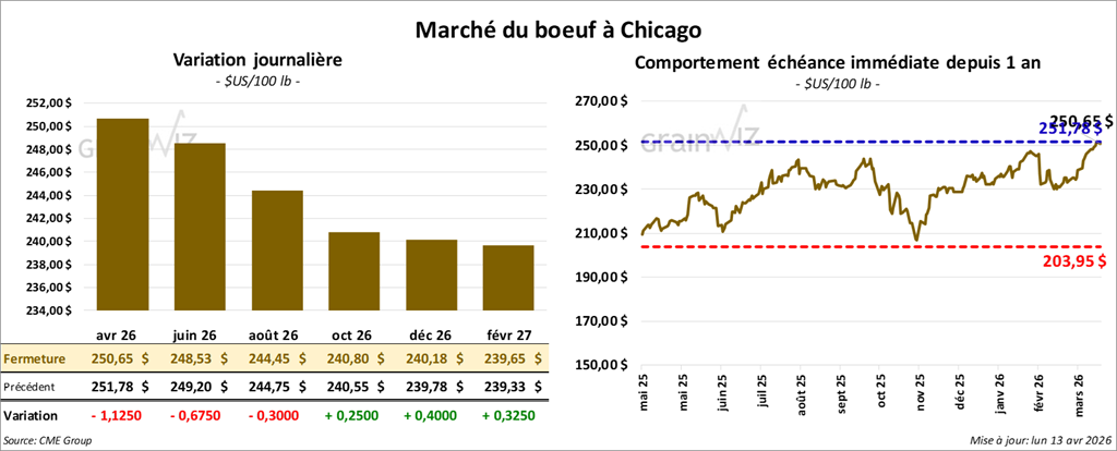 Le contrat de bœuf américain juin 26 a clôturé à 248,53 $ (-68 cents). Celui août 26 a fermé à 244,45 $ (-30 cents). Celui octobre 26 a terminé à 240,80 $ (+25 cents).