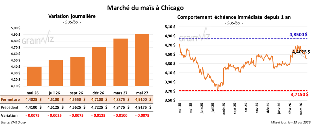 Le contrat de maïs américain mai 26 a clôturé à 4,4025 $ (-¾ cent). Celui juillet 26 a fermé à 4,5100 $ (-¼ cent). Celui septembre 26 a terminé à 4,5550 $ (-¾ cent).