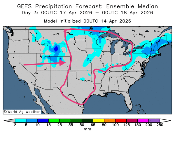 - De manière générale, les conditions météorologiques demeurent correctes dans la plupart des régions des États-Unis. L’analyse des cartes GFS (World Ag Weather), dessinées jusqu’au 3e jour, montre encore des possibilités de pluies parfois abondantes, de la région des Grands Lacs jusqu’au sud-ouest, vers le Texas, en passant par l’Iowa et le Missouri. Par la suite, un temps plus ensoleillé et bénéfique pourrait toutefois s’installer, comme l’indique la carte du 3e jour ci-contre.
