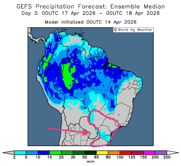 - Globalement, les conditions météorologiques continuent de s’améliorer dans plusieurs régions du Brésil. L’analyse des cartes GFS (World Ag Weather), illustrées jusqu’au 3e jour, indique surtout des possibilités d’assèchement, bénéfiques pour la plupart des secteurs de production. Toutefois, comme le montre la carte du 3e jour ci-contre, une sécheresse dévastatrice persistera probablement dans certains secteurs du Sud et du Sud-Est, notamment autour du Mato Grosso do Sul et plus à l’est du São Paulo, jusqu’au Rio Grande do Sul.