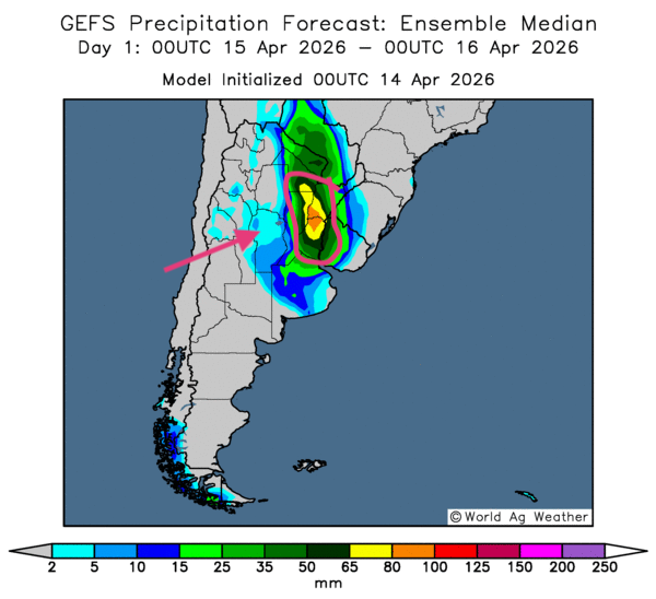 - Essentiellement, les conditions météorologiques demeurent à surveiller à court terme en Argentine. L’analyse des cartes GFS (World Ag Weather), tracées jusqu’au 3e jour, révèle des possibilités de pluies très abondantes dans une bonne partie du nord-est du pays (voir notamment la carte de demain ci-contre). Dans ce secteur, des inondations localisées pourraient survenir par endroits. Ailleurs, le temps sec pourrait se poursuivre. Mais bien que l’humidité des sols puisse être adéquate à plusieurs endroits, des risques de stress hydrique persisteront probablement dans certaines régions, notamment dans le sud.