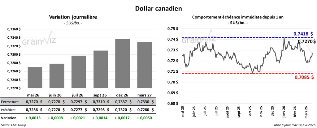 Du côté de l’huile de soya américaine, le contrat mai 26 a terminé à 66,44 $ (- 6 points). Celui juillet 26 a fini à 66,22 $ (- 14 points).