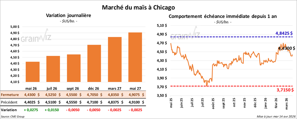Le contrat de maïs américain mai 26 a clôturé à 4,4300 $ (+ 2 ¾ cents). Celui juillet 26 a fermé à 4,3525 $ (+ 1 ½ cent). Celui septembre 26 a terminé à 4,5550 $ (0,0).