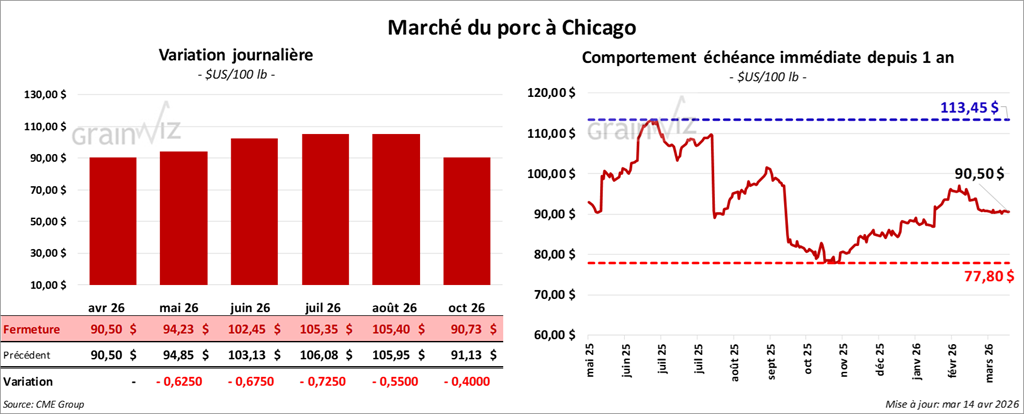 Le contrat de porc américain mai 26 a clôturé à 94,23 $ (- 63 cents). Celui juin 26 a fermé à 102,45 $ (- 6 ¾ cents). Celui juillet 26 a terminé à 105,35 $ (- 7 ¼ cents).