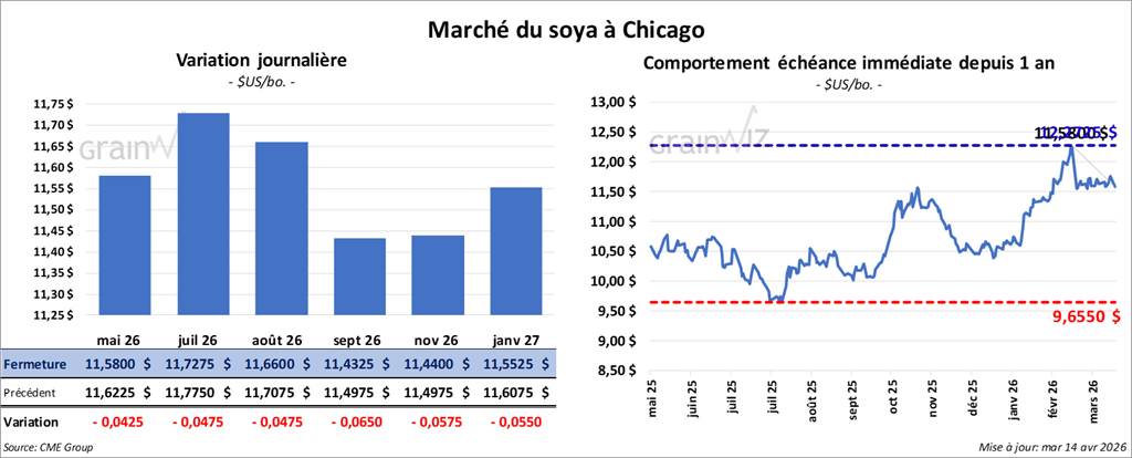 Le contrat de soya mai 26 a clôturé à 11,5800 $ (- 4 ¼ cents). Celui juillet 26 a fermé à 11,7275 $ (- 4 ¾ cents). Celui août 26 a terminé à 11,6600 $ (- 4 ¾ cents).