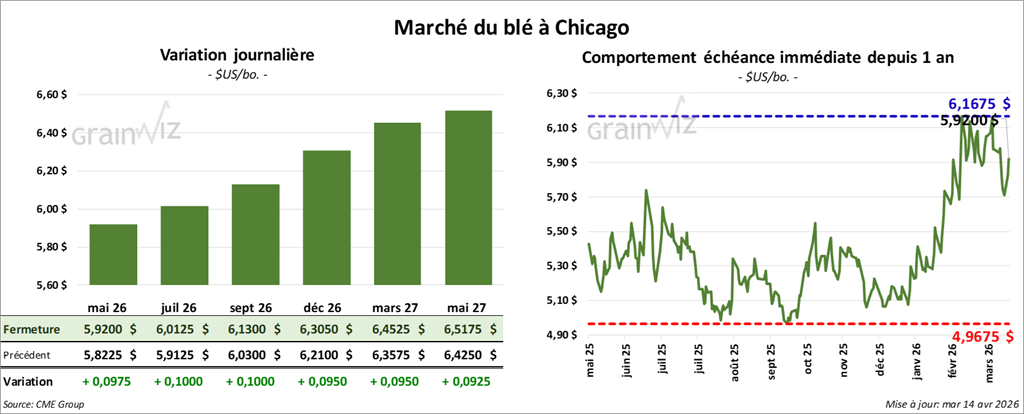 À Chicago, le contrat de blé mai 26 a clôturé à 5,9200 $ (+ 9 ¾ cents). Celui juillet 26 a fermé à 6,0125 $ (+ 10 cents). Celui septembre 26 a terminé à 6,1300 $ (+ 10 cents).