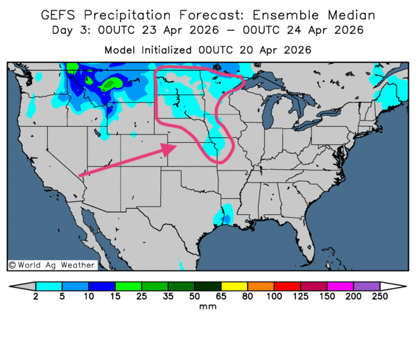 - De manière générale, les prévisions météorologiques à court terme pour les États-Unis demeurent correctes. L’analyse des cartes GFS (World Ag Weather), tracée jusqu’au 3e jour, montre des probabilités de temps sec sur une bonne partie du Midwest et des Grandes Plaines. Cependant, des précipitations, le plus souvent légères, pourraient survenir à plusieurs endroits, comme le montre la carte du 3e jour ci-contre.