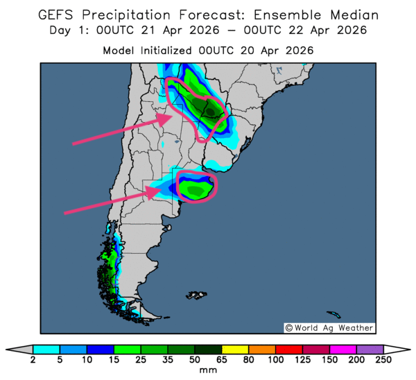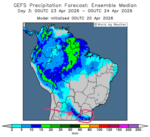- Essentiellement, les conditions météorologiques demeurent favorables à court terme dans une bonne partie de l’Argentine. L’analyse des cartes GFS (World Ag Weather), tracée jusqu’au 3e jour, révèle des possibilités de pluies parfois intenses uniquement dans le nord et certaines portions de l’est (voir notamment la carte de demain, ci-contre). Ailleurs, le temps sec persistant pourrait dominer.