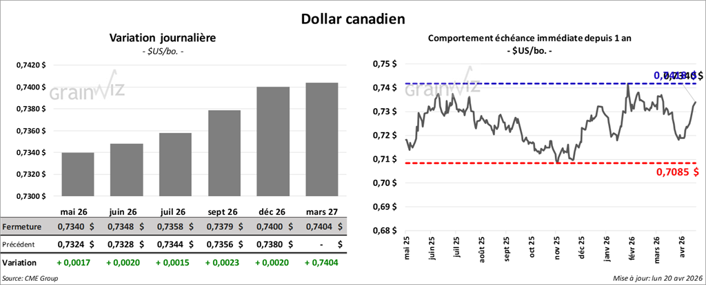 Du côté de l’huile de soya américaine, le contrat mai 26 a terminé à 69,63 $ (+ 147 points). Celui de juillet 26 a fini à 69,30 $ (+ 139 points).