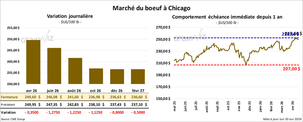 Le contrat de bœuf américain juin 26 a clôturé à 246,08 $ (- 1,23 $). Celui d’août 26 a fermé à 241,60 $ (- 1,23 $). Celui d’octobre 26 a terminé à 236,98 $ (- 1,13 $).