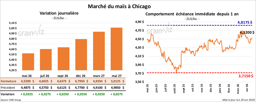 Le contrat de maïs américain mai 26 a clôturé à 4,5200 $ (+ 3 ¼ cents). Celui de juillet 26 a fermé à 4,6025 $ (+ 2 ¾ cents). Celui de septembre 26 a terminé à 4,6375 $ (+ 2 ½ cents).