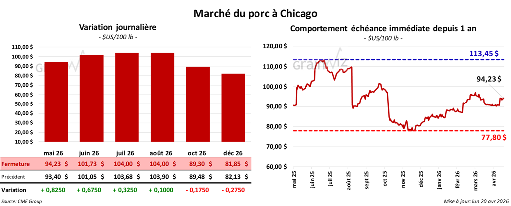 Le contrat de porc américain mai 26 a clôturé à 94,23 $ (+ 83 cents). Celui de juin 26 a fermé à 101,73 $ (+ 68 cents). Celui de juillet 26 a terminé à 104,00 $ (+ 33 cents).
