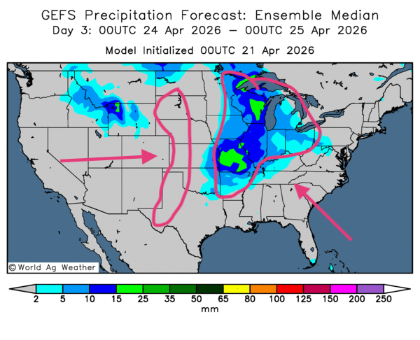 - De manière générale, les conditions météorologiques aux États-Unis restent correctes à court terme, du moins. L’analyse des cartes GFS (World Ag Weather) tracées jusqu’au 3e jour indique un temps variable à l’échelle du territoire. Par contre, comme le montre cette carte du 3e jour ci-contre, des averses plus ou moins abondantes pourraient toucher plusieurs régions des Grands Lacs, plus à l’ouest et au sud-ouest. Des États comme l’Iowa et le Missouri pourraient recevoir des pluies favorables. À noter toutefois que plusieurs portions des régions asséchées de l’ouest des Plaines américaines pourraient demeurer sans les précipitations pourtant nécessaires.