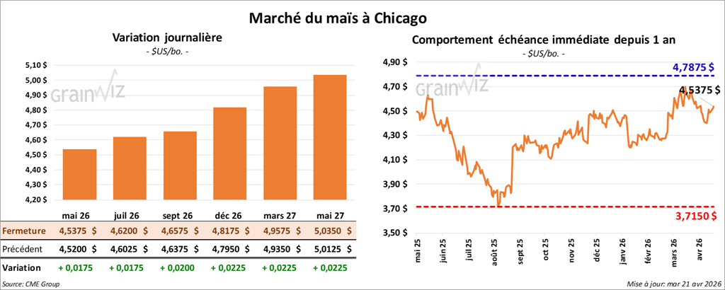 Le contrat de maïs américain de mai 26 a clôturé à 4,5375 $ (+ 1 ¾ cent). Celui de juillet 26 a fermé à 4,6200 $ (+ 1 ¾ cent). Celui de septembre 26 a terminé à 4,6575 $ (+ 2 cents).