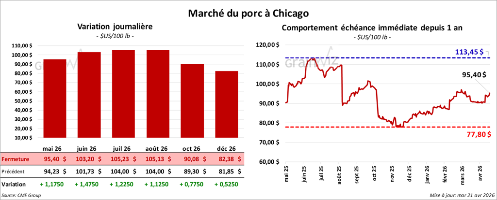 Le contrat de porc américain de mai 26 a clôturé à 95,40 $ (+ 1,18 $). Celui de juin 26 a fermé à 103,20 $ (+ 1,48 $). Celui de juillet 26 a terminé à 105,23 $ (+ 1,23 $).