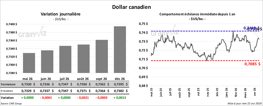 Le contrat de maïs américain mai 26 a clôturé à 4,5425 $ (+ ½ cent). Celui de juillet 26 a fermé à 4,6275 $ (+ ¾ cent). Celui de septembre 26 a terminé à 4,6700 $ (+ 1 ¼ cent).