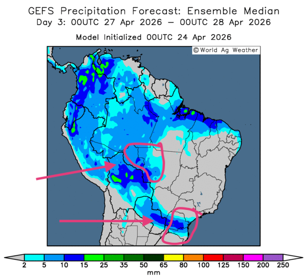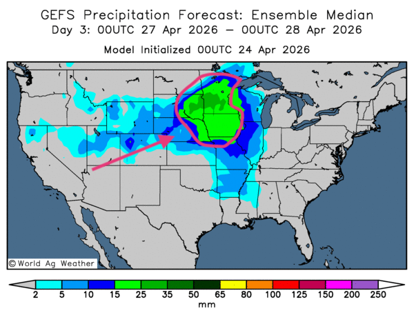 - De manière générale, les prévisions météorologiques pour les États-Unis restent à surveiller à court terme. L’analyse des cartes GFS (World Ag Weather) tracées jusqu’au 3e jour indique des possibilités de pluie, parfois abondante, pour le sud et l’ouest des Grands Lacs. Le Minnesota, l’Iowa, certaines parties du Dakota du Sud et du Nebraska pourraient recevoir de fortes averses (voir notamment la carte du 3e jour ci-contre). Même plusieurs secteurs asséchés de l’ouest des Plaines, à l’exception du Texas, pourraient profiter de précipitations bénéfiques.