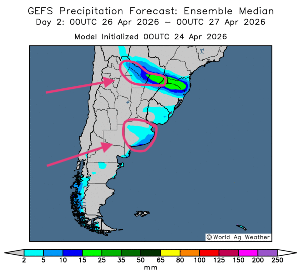 - Essentiellement, les prévisions météorologiques pour l’Argentine demeurent favorables à court terme. L’analyse des cartes GFS (World Ag Weather) dessinées jusqu’au 3e jour indique des possibilités d’averses pour le nord et certaines parties de l’est du pays (voir notamment la carte du 2e jour ci-contre). Ailleurs, un temps sec et favorable devrait prévaloir dans le centre et dans plusieurs secteurs de l’ouest de l’Argentine. Par contre, le sud pourrait encore composer avec une sécheresse persistante.