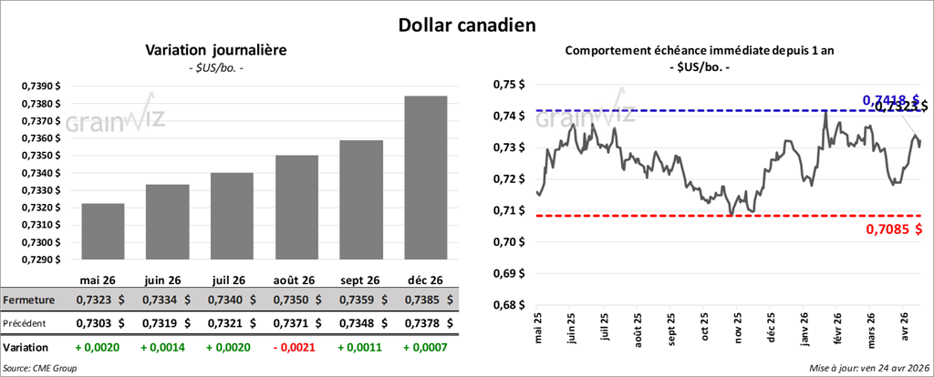 Du côté de l’huile de soya américaine, le contrat de mai 26 a terminé à 71,91 $ (+ 25 points). Celui de juillet 26 a fini à 71,33 $ (+ 28 points).
