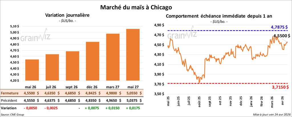 Le contrat de maïs américain mai 26 a clôturé à 4,5500 $ (- ½ cent). Celui de juillet 26 a fermé à 4,6350 $ (- ¼ cent). Celui de septembre 26 a terminé à 4,6850 $ (0,0).