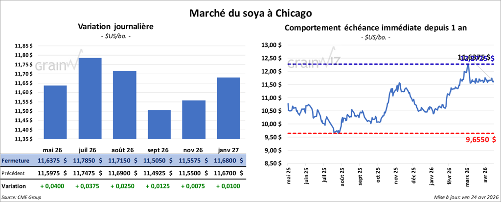 Le contrat de soya mai 26 a clôturé à 11,6375 $ (+ 4 cents). Celui de juillet 26 a fermé à 11,7850 $ (+ 3 ¾ cents). Celui d’août 26 a terminé à 11,7150 $ (+ 2 ½ cents).